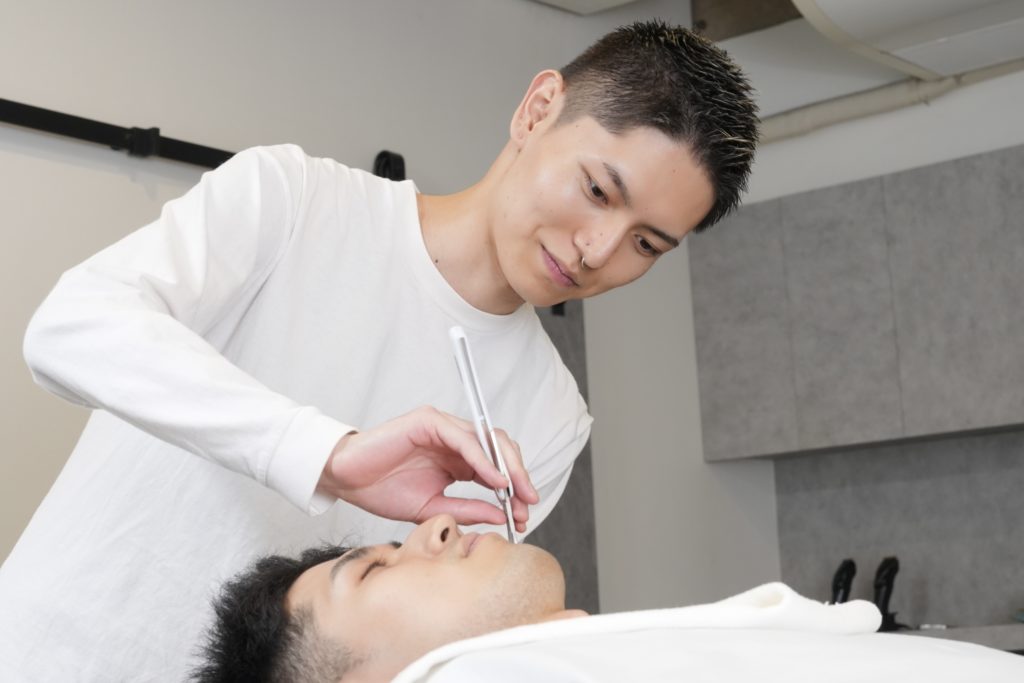 セルフケアでは難しい目や耳の周りの産毛も理容師のみ使える一枚刃の剃刀でしっかり処理させていただきます。